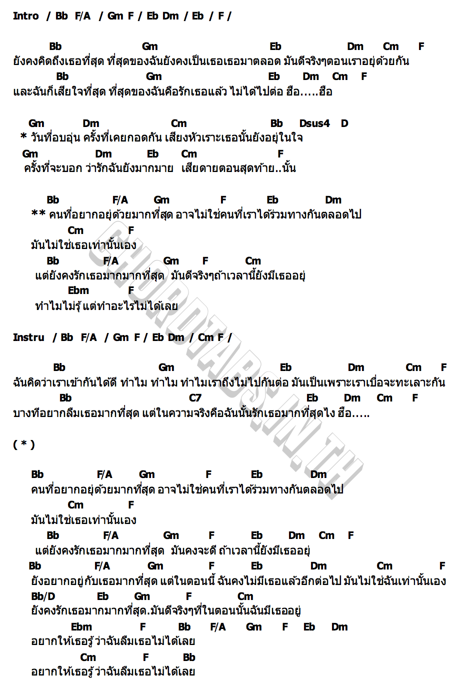 คนที่อยากอยุ่ด้วยมากที่สุด อาจไม่ใช่คนที่เราได้ร่วมทางกันตลอดไปมันไม่ใช่เธอเท่านั้นเอง แต่ยังคงรักเธอมากมากที่สุดมันดีจริงๆถ้าเวลานี้ยังมีเธออยุ่ ทำไมไม่รุ้