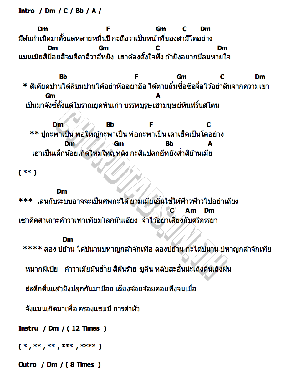 (ลำ ต้อย) ลอง บ่ย้านได้บ่นานบ่หาญกล้าจักเทือ ลองบ่ย้านกะได้บ่นานบ่หาญกล้าจักเทีย หมากผีเบียคำวาเมียมันฮ้ายสิฝันร้ายซูคืน หลับสะอื้นน่ะเถิงตื่นเถิงฝัน ดึกดื่นแล้วยังปลุกกันมาป้อย เสียงจ้อยจ้อย คอยฟังจนเบื่อ จังแมนเกิดมาเผื่อครองแชมป์การด่าผัว...เฮ่อเฮ้อ (SoLo กีตาร์ จบ)