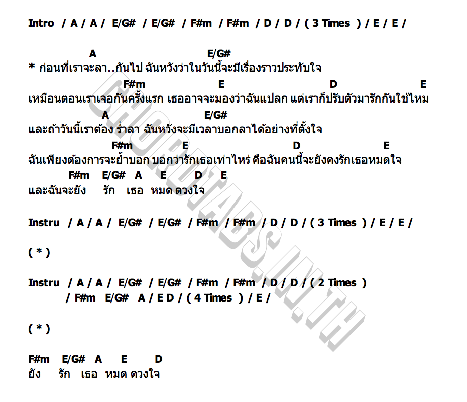 ฉันเพียงต้องการจะย้ำบอก บอกว่ารักเธอเท่าไหร่ คือฉันคนนี้จะยังคงรักเธอหมดใจ และฉันจะยังรักเธอหมดดวงใจ