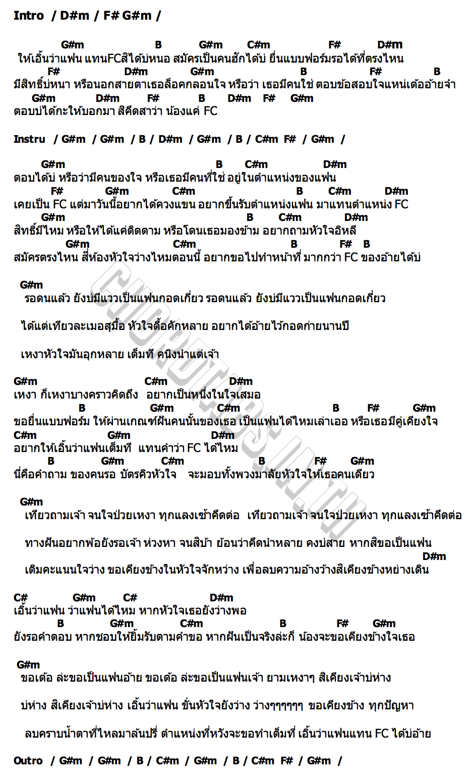 ให้เอิ้นว่าแฟน แทนFCสิได้บ่หนอ สมัครเป็นคนฮักได้บ่ ยื่นแบบฟอร์มรอได้ที่ตรงไหน มีสิทธิ์บ่หนาหรือนอกสายตาเธอล็อคกลอนหัวใจ หรือว่า เธอมีคนใช่ ตอบข้อสอบใจแหน่เด้ออ้ายจ๋า ตอบบ่ได้กะให้บอกมา สิคึดสาว่าน้องแค่ FC