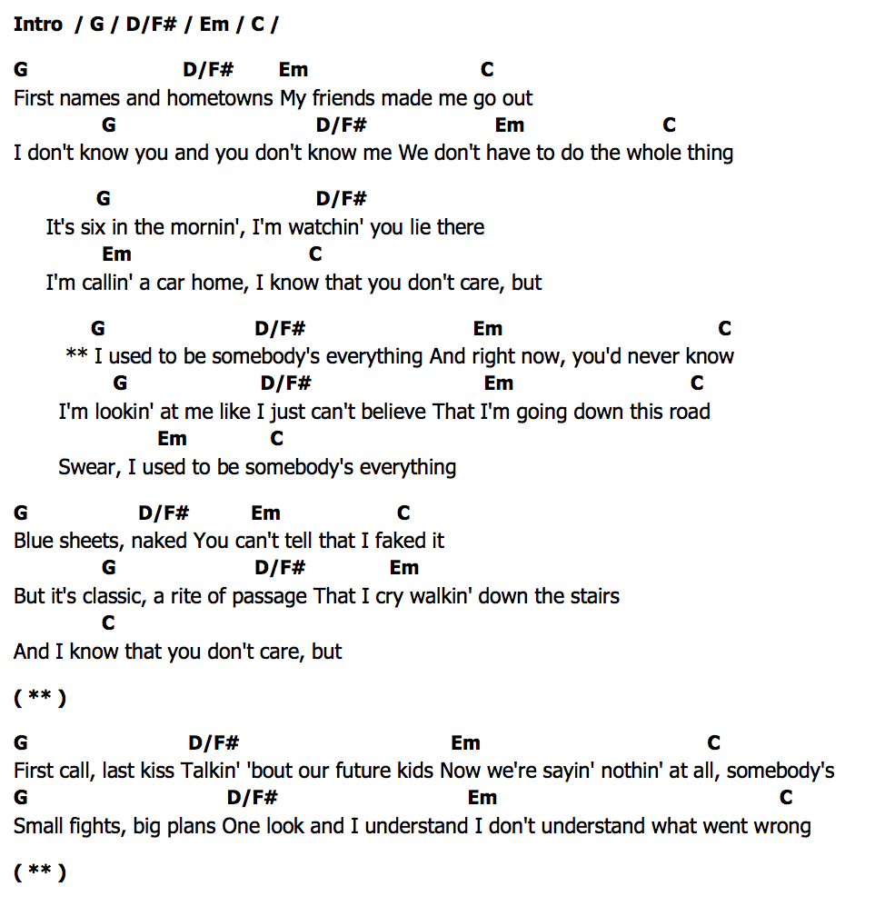 ** I used to be somebody's everything And right now, you'd never know