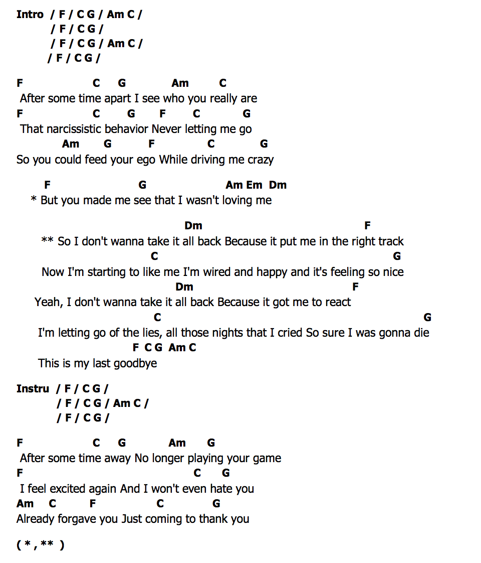 ** So I don't wanna take it all back Because it put me in the right track