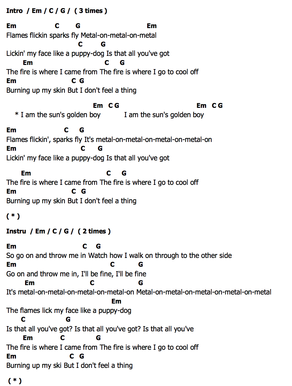 Flames flickin', sparks fly It's metal-on-metal-on-metal-on-metal-on