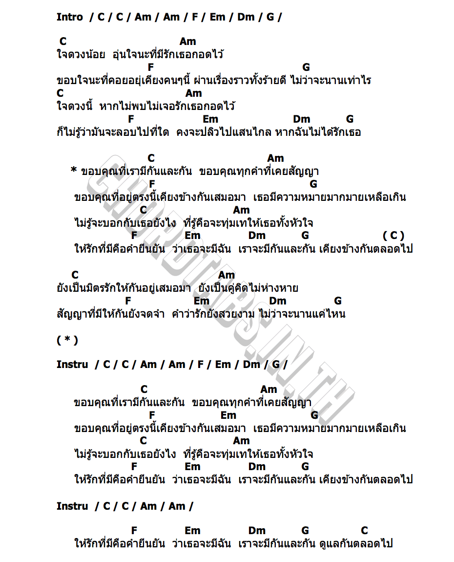 ใจดวงน้อย อุ่นใจนะที่มีรักเธอกอดไว้ ขอบใจนะที่คอยอยุ่เคียงคนๆนี้ ผ่านเรื่องราวทั้งร้ายดี ไม่ว่าจะนานเท่าไร