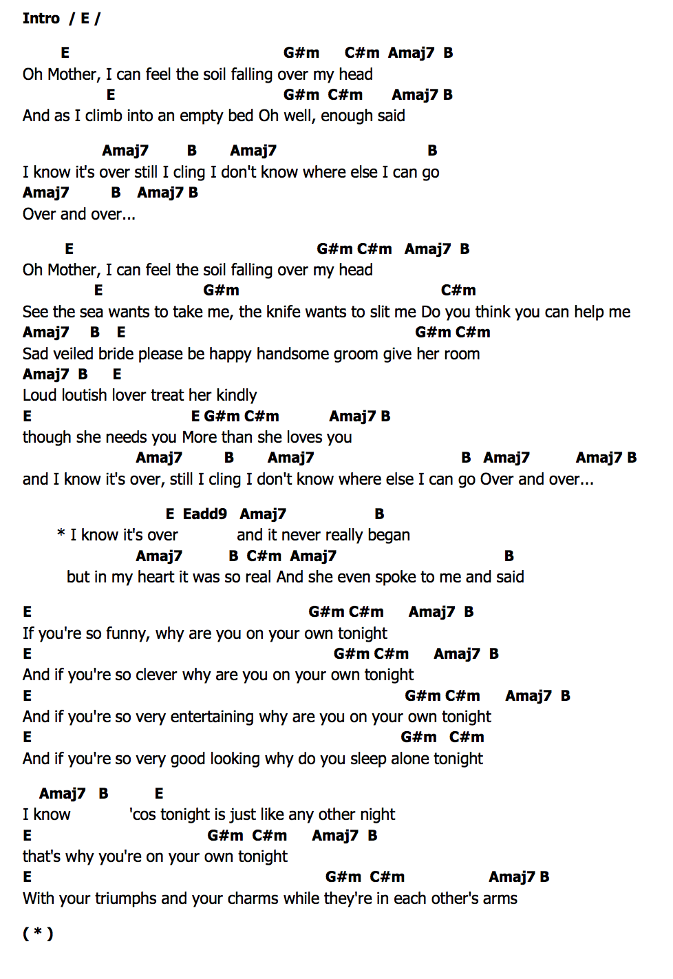 and I know it's over, still I cling I don't know where else I can go Over and over...