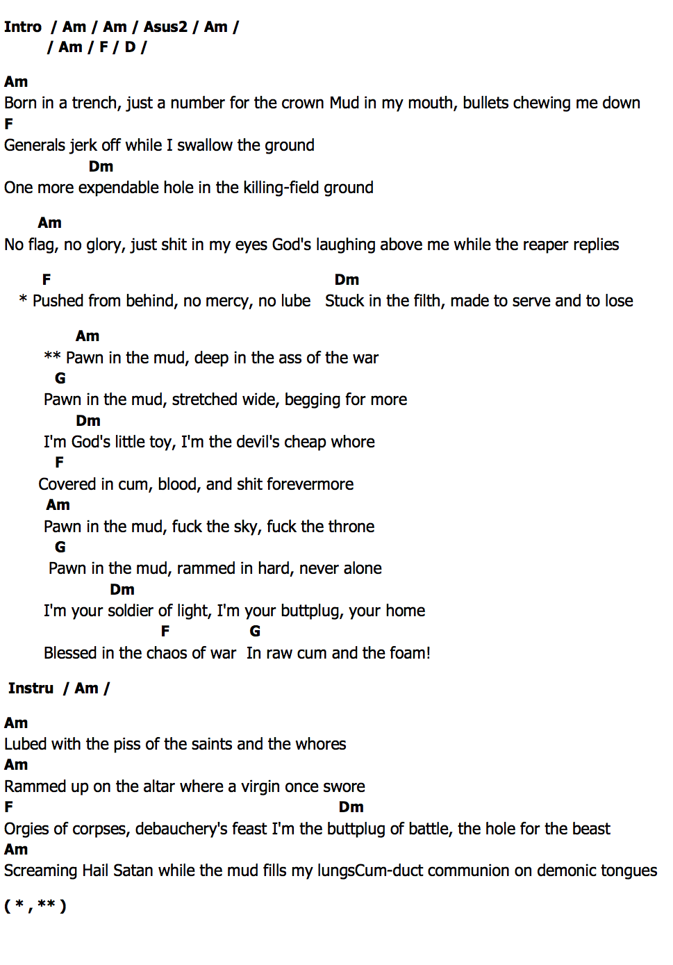 Screaming Hail Satan while the mud fills my lungsCum-duct communion on demonic tongues