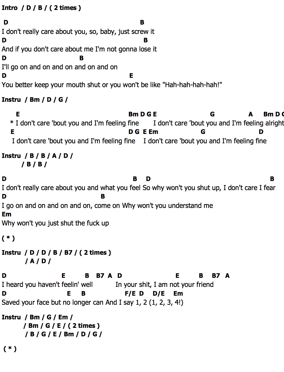 I don't care 'bout you and I'm feeling fine I don't care 'bout you and I'm feeling fine!